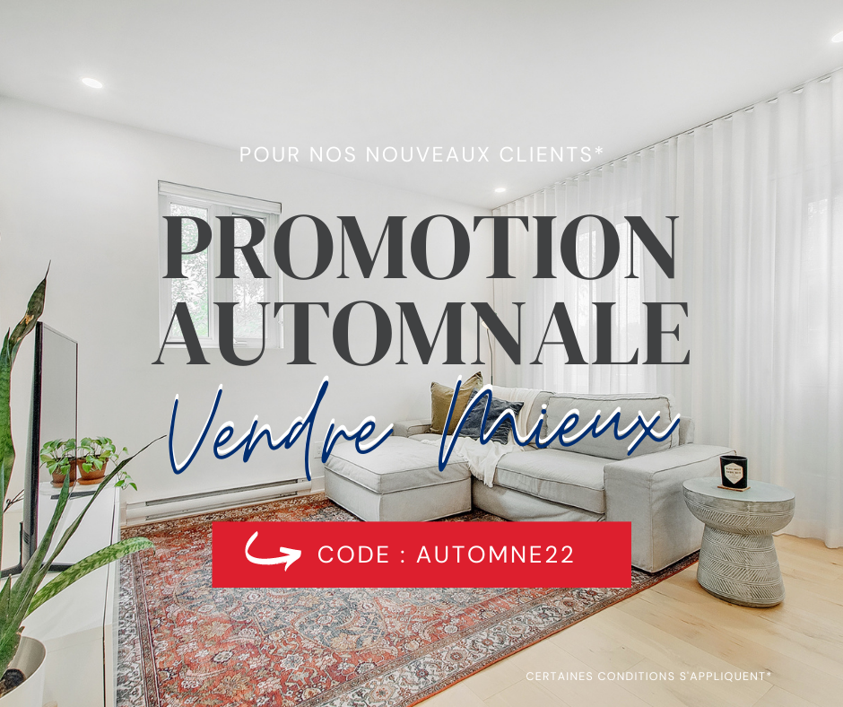 Notre promotion automnale en vigueur jusqu’au 21 décembre 2022 s’adresse à tous nos nouveaux clients qui désirent vendre leur propriété. Vous n’avez qu’à mentionner la promotion automne 2022 à votre courtier attitré pour y avoir droit. Si vous n’avez aucuns frais à payer lors de votre visite chez le notaire, d’autres frais reliés à votre vente vous seront remboursés pour le même montant.
