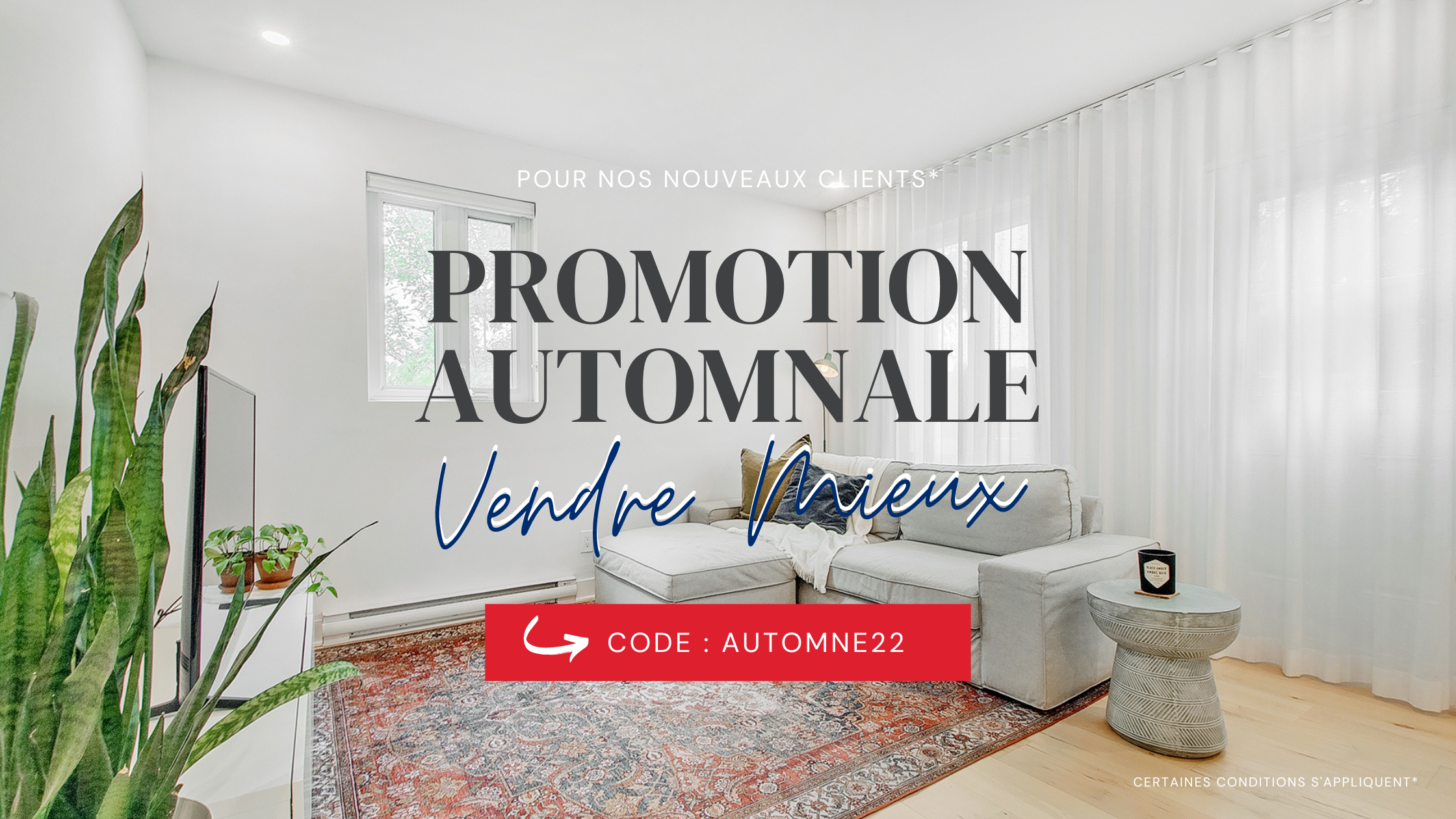 Notre promotion automnale en vigueur jusqu’au 21 décembre 2022 s’adresse à tous nos nouveaux clients qui désirent vendre leur propriété. Vous n’avez qu’à mentionner la promotion automne 2022 à votre courtier attitré pour y avoir droit. Si vous n’avez aucuns frais à payer lors de votre visite chez le notaire, d’autres frais reliés à votre vente vous seront remboursés pour le même montant.